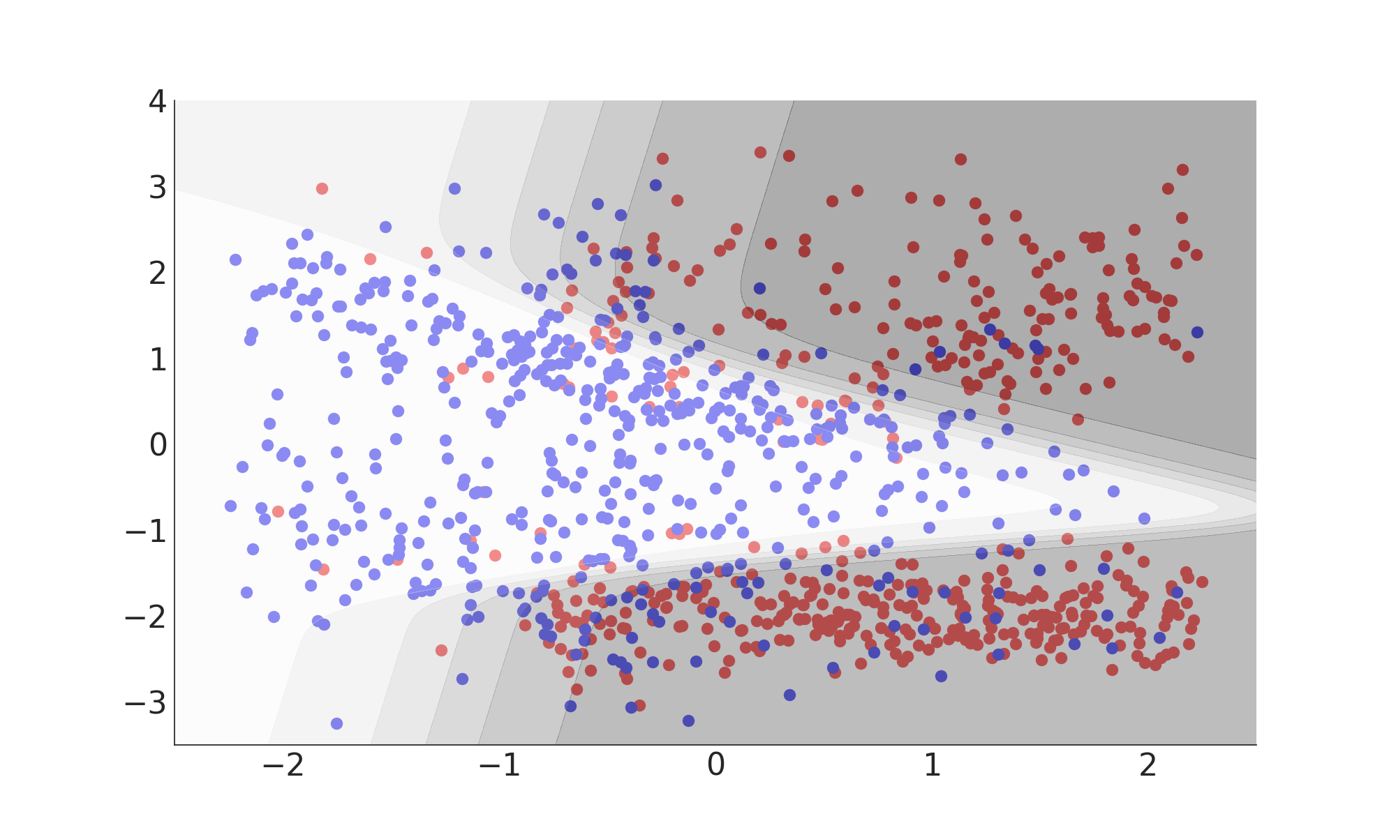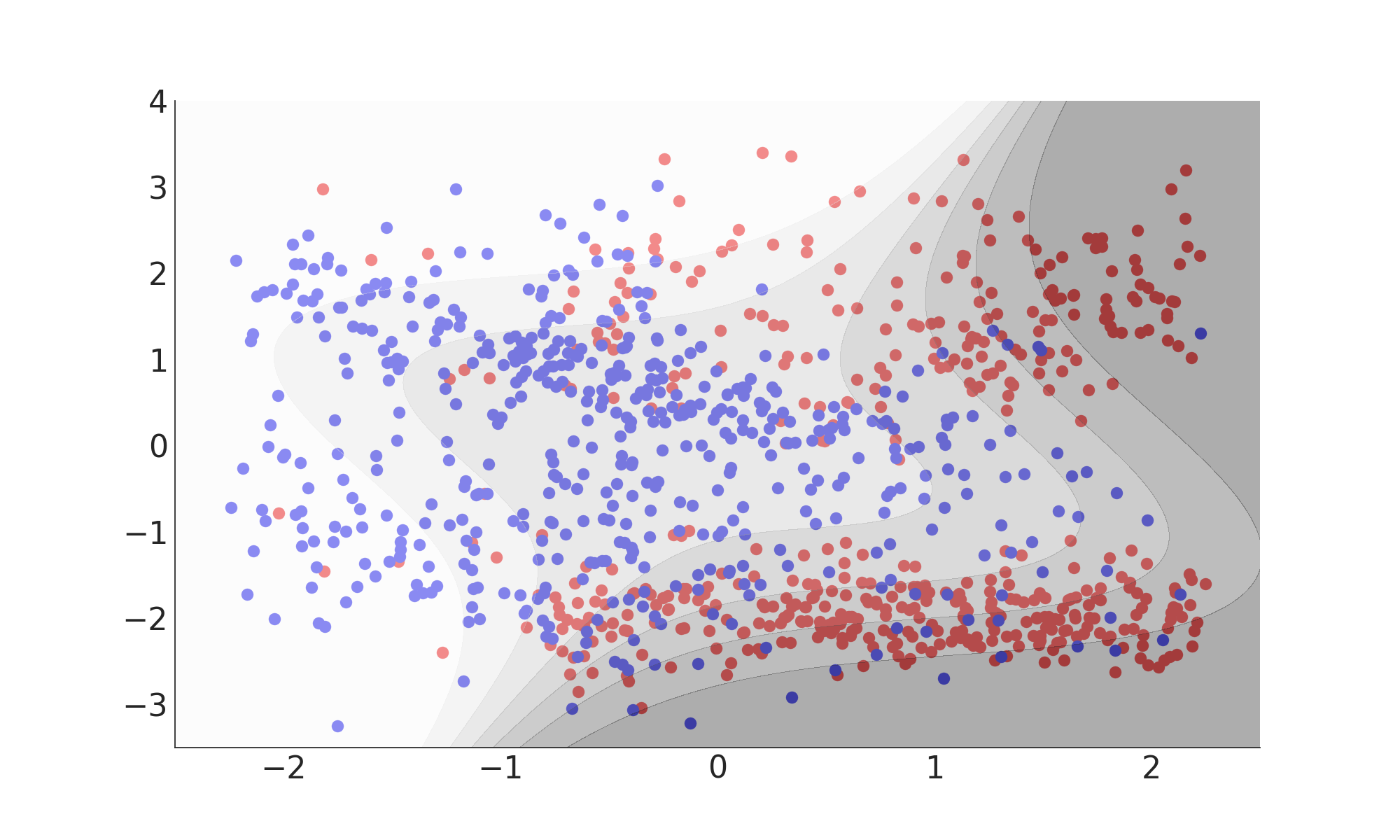 $ f(x) = \frac{\sqrt{2 \pi | \Sigma_{\mathrm{B}} |} \exp\left( - \frac{1}{2} \left(x - \mu_{\mathrm{S}}\right)^{\mathrm{T}} \Sigma^{-1}_{\mathrm{S}} \left(x - \mu_{\mathrm{S}}\right) \right) }{ \sqrt{2 \pi | \Sigma_{\mathrm{S}} |} \exp\left( - \frac{1}{2} \left(x - \mu_{\mathrm{B}}\right)^{\mathrm{T}} \Sigma^{-1}_{\mathrm{B}} \left(x - \mu_{\mathrm{B}}\right) \right) }$